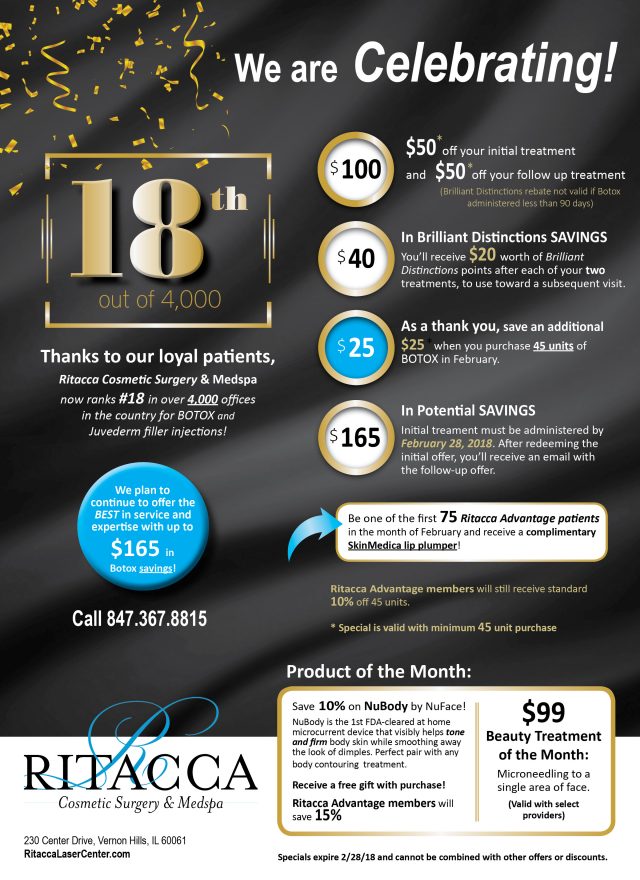 RL Center for Cosmetic Surgery and Medspa remains the premier destination for injectables in the Chicago area, and they look forward to serving more patients with exceptional cosmetic care. To celebrate this exciting accomplishment, RL Center for Cosmetic Surgery and Medspa is offering some incredible discounts for those seeking injectables. Patients can receive $50 off their initial Botox treatment and $50 off their follow-up treatment. Patients will also receive $20 worth of Brilliant Distinctions points after each of their two treatments to be used toward a subsequent visit. To learn more and take advantage of these savings before they expire, visit RL Center for Cosmetic Surgery and Medspa’s Facebook profile.